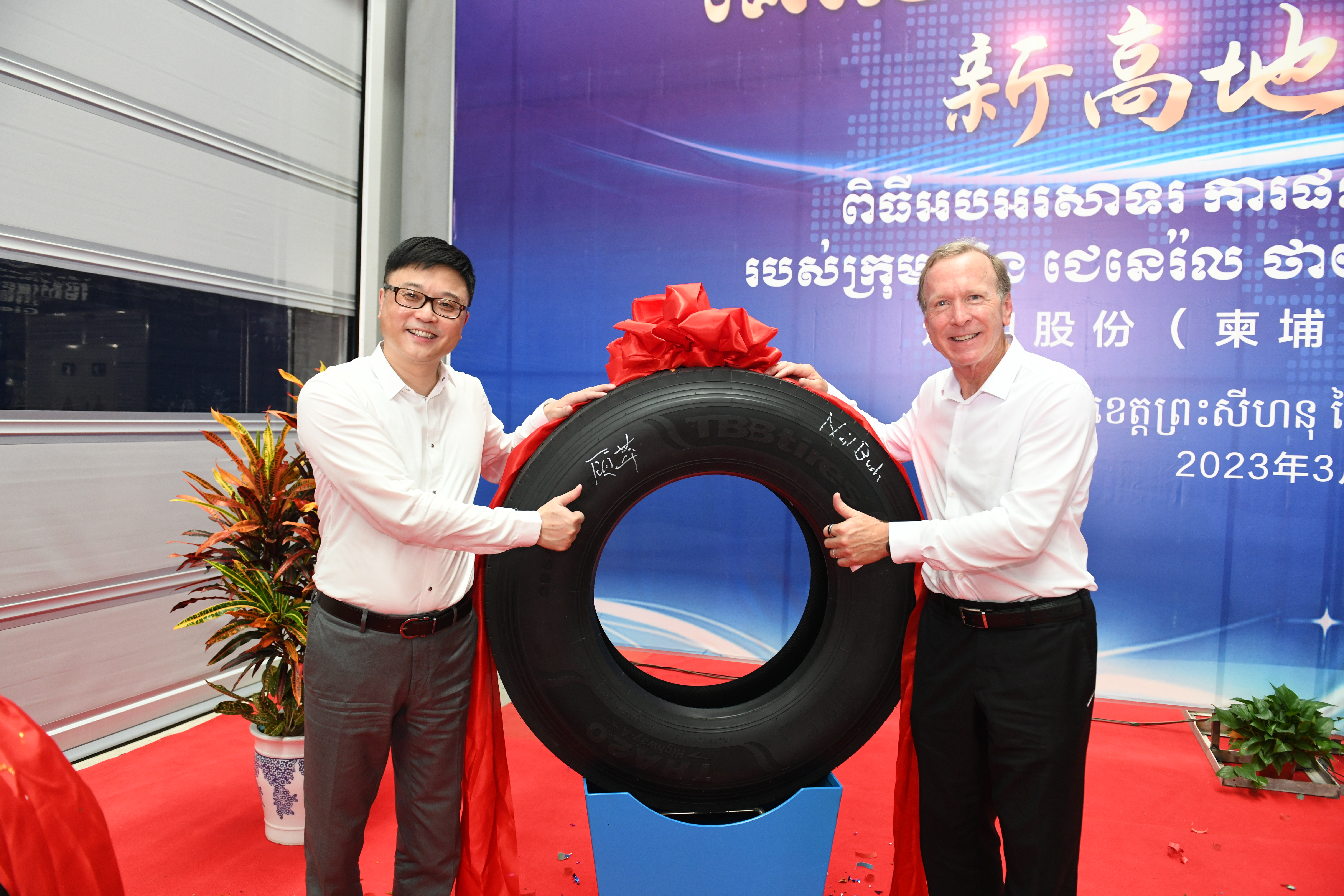 “5、4、3、2、1,出鍋!.......”3月18日,在通用輪胎科技柬埔寨公司總經(jīng)理陶國(guó)忠的倒數(shù)聲中,柬埔寨工廠首胎成功下線,標(biāo)志著通用股份海外“雙基地”的正式建成、全面啟航。在首胎下線儀式上,西哈努克省省長(zhǎng)郭宗仁、喬治·布什美中關(guān)系基金會(huì)創(chuàng)始人兼主席尼爾·布什,中國(guó)民營(yíng)經(jīng)濟(jì)國(guó)際合作商會(huì)會(huì)長(zhǎng)、紅豆集團(tuán)董事局主席周海江,通用股份董事長(zhǎng)顧萃等相關(guān)領(lǐng)導(dǎo)和全體員工共同見證了這一歷史時(shí)刻。