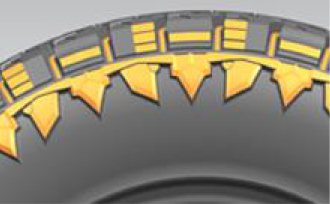 為非鋪裝提供更多的牽引力也能保證鋪裝路面行駛的穩(wěn)定性,花紋塊邊緣切角設(shè)計(jì),有效增大接地面積,提高抓地性能。